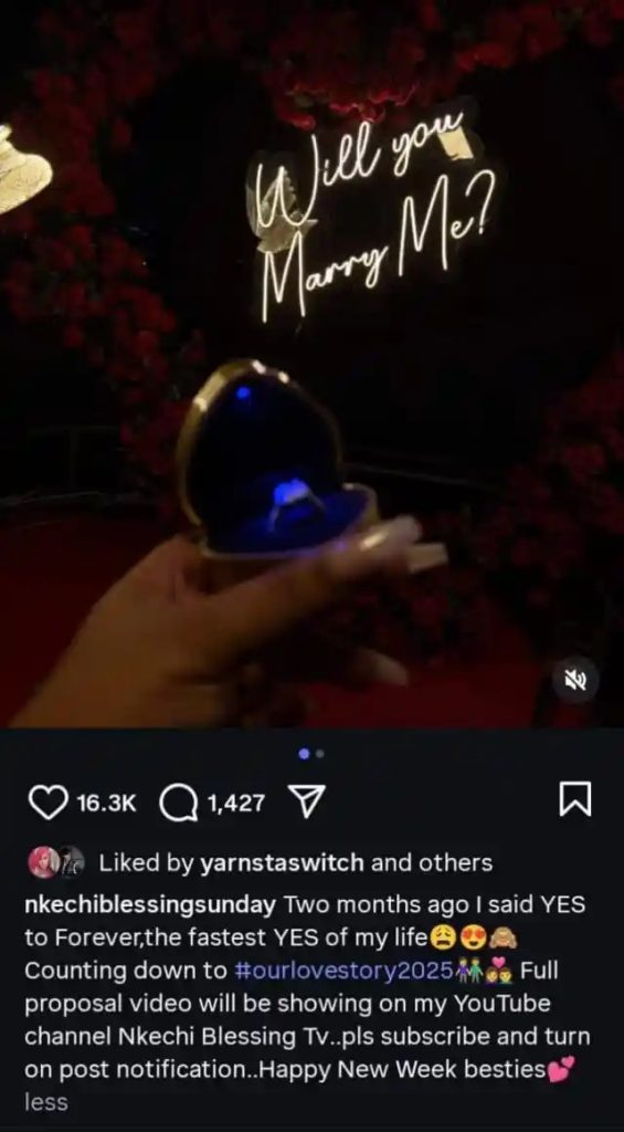 She wrote: “Two months ago, I said YES to forever the fastest YES of my life. Counting down to #OurLoveStory2025. A full proposal video will be shown on my YouTube channel, Nkechi Blessing TV. Please subscribe and turn on post notifications. Happy new week, besties.”