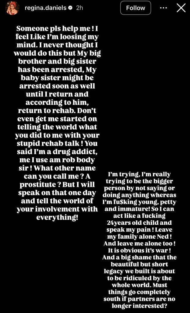 Nollywood actress Regina Daniels has accused her estranged husband, businessman and politician Ned Nwoko, of ordering the arrest of her siblings in an attempt to force her into returning to rehab over alleged drug use.