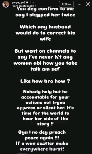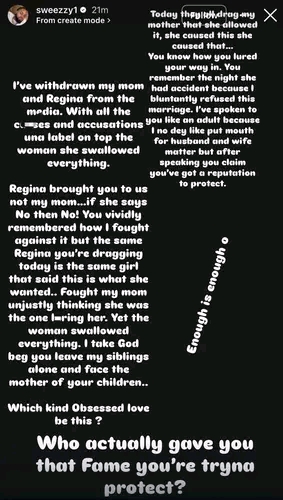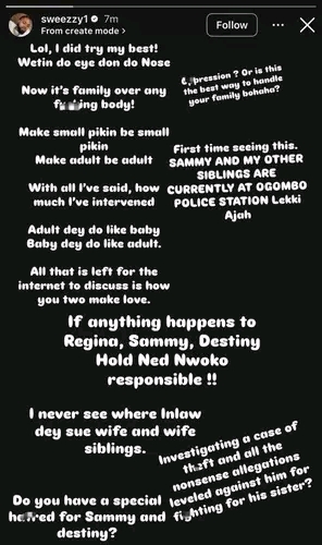 Sweezy’s post comes amid growing tension between Nwoko and the Daniels family, following Regina Daniels’ recent claim that her estranged husband ordered the arrest of her siblings and was trying to force her into returning to rehab over alleged drug use.