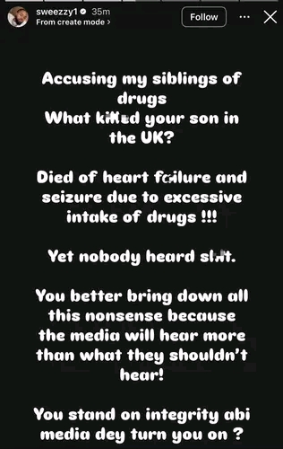 He wrote: “Accusing my siblings of drugs. What killed your son in the UK? Died of heart failure and seizure due to excessive intake of drugs! Yet nobody heard anything. You better bring down all this nonsense because the media will hear more than what they shouldn’t hear! You stand on integrity abi?”