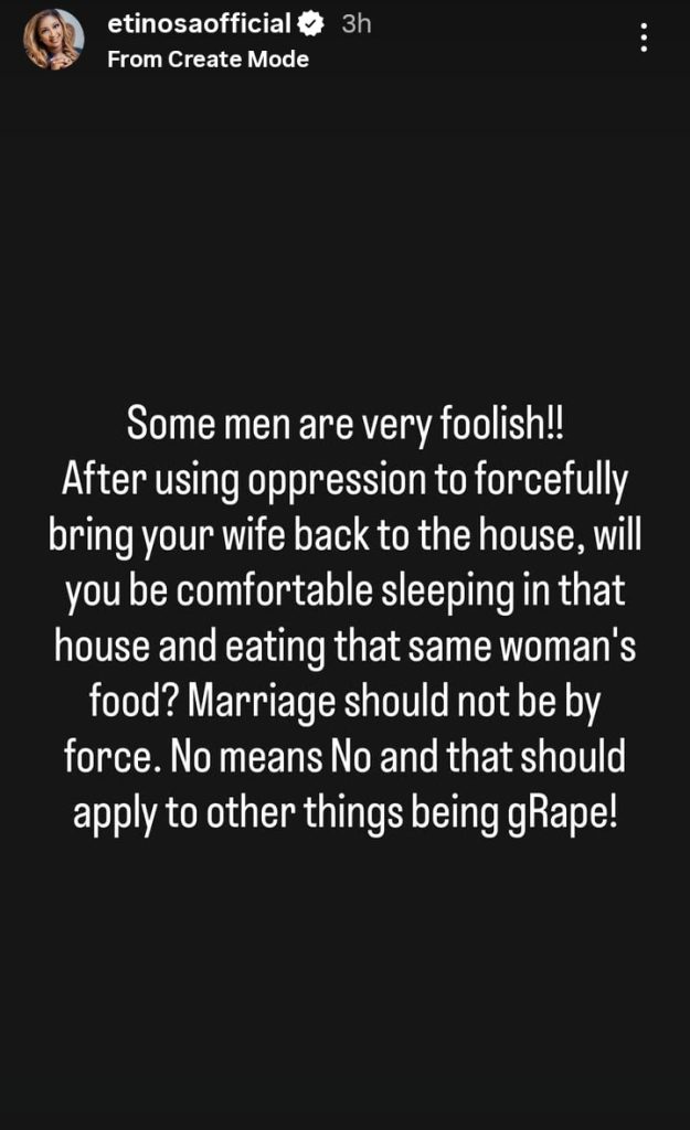 Nollywood actress Etinosa Idemudia has criticized men who use power or influence to forcefully bring their wives back after a disagreement, saying that marriage should never be imposed on anyone.