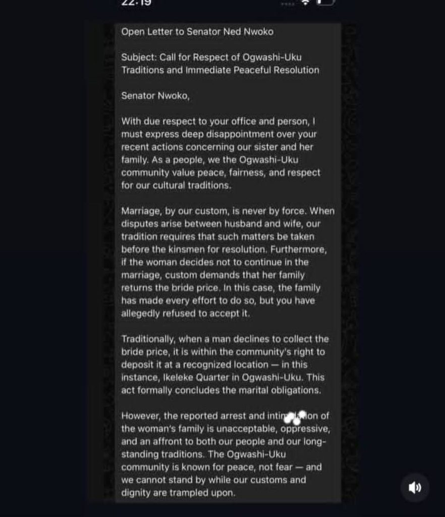 The family, in an open letter signed by Favour Awele Obi, accused the senator of ignoring local customs and using his influence to intimidate Regina’s relatives. They stated that, according to their tradition, once a woman chooses to leave her marriage, her family must return the bride price to formally end the union.