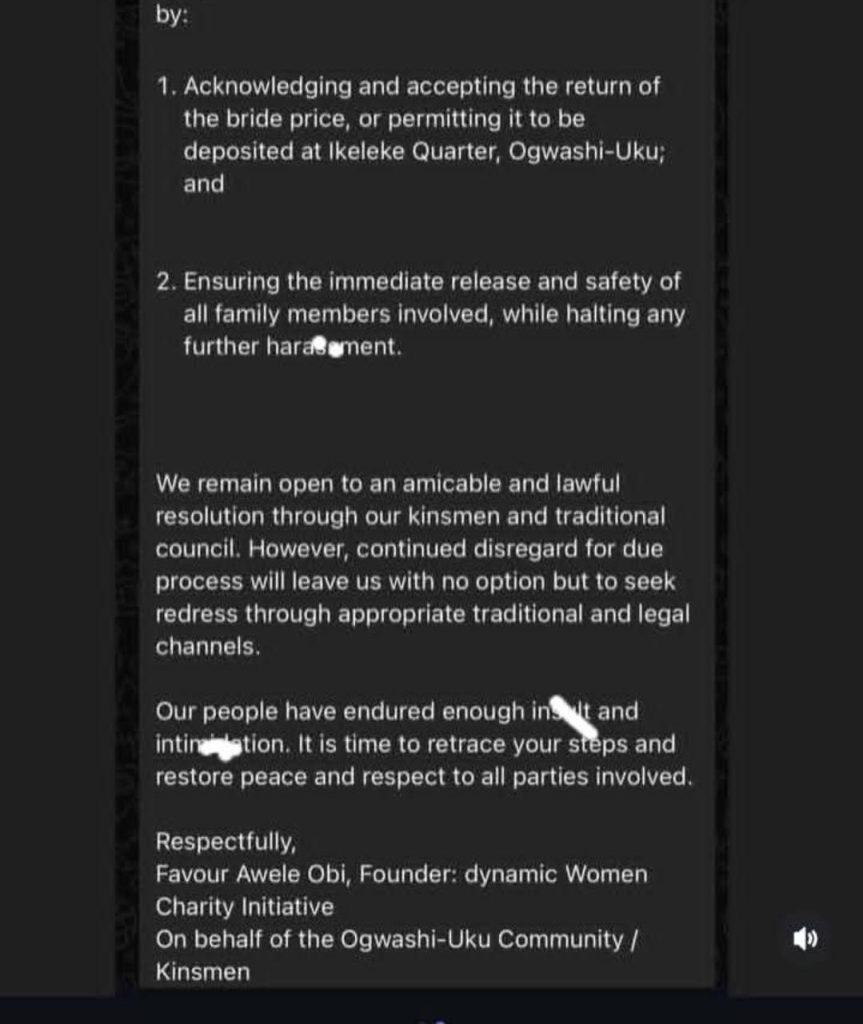 According to them, several efforts had been made to return the payment, but Nwoko allegedly refused to accept it. They added that if he continues to reject it, the money would be placed at the Ikeleke Quarter in Ogwashi-Uku, a traditional act symbolizing the end of the marriage.