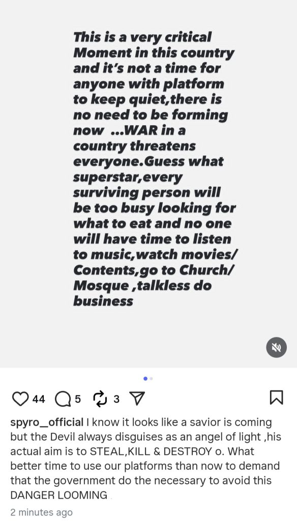 In a passionate message shared on social media, Spyro warned that countries claiming to help Nigeria are only coming “to kill, steal, and destroy.” He urged Nigerians, especially public figures, to use their platforms to demand accountability from the government and prevent any escalation into war.