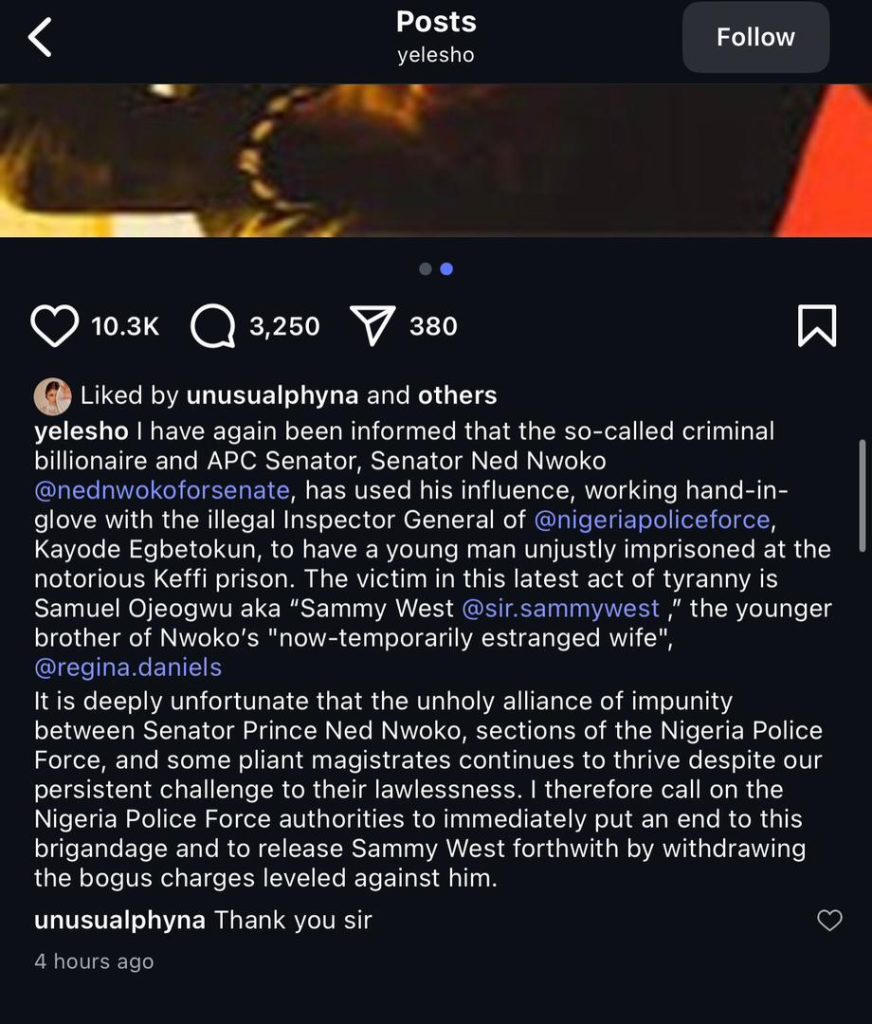 In a post shared on his Instagram page, Sowore alleged that Senator Nwoko was behind Sammy West’s reported detention at Keffi Prison. He described the situation as a gross abuse of power and an example of how political influence is being used to silence ordinary citizens.
