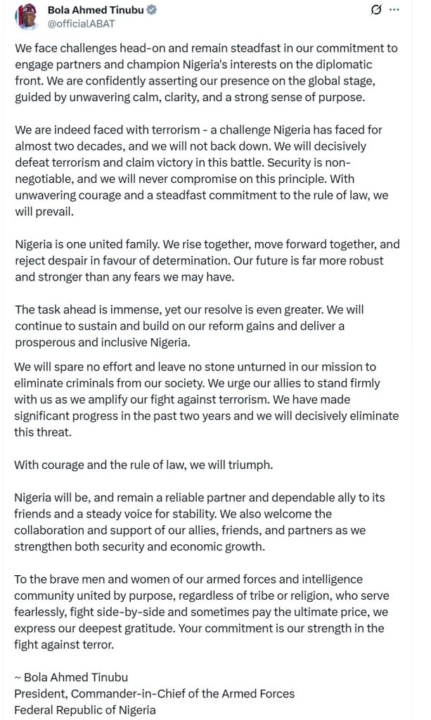 The President made this known in a statement shared on his official X account on Friday, a few days after United States President Donald Trump warned that Washington could take military action against Nigeria over reported attacks on Christians.
