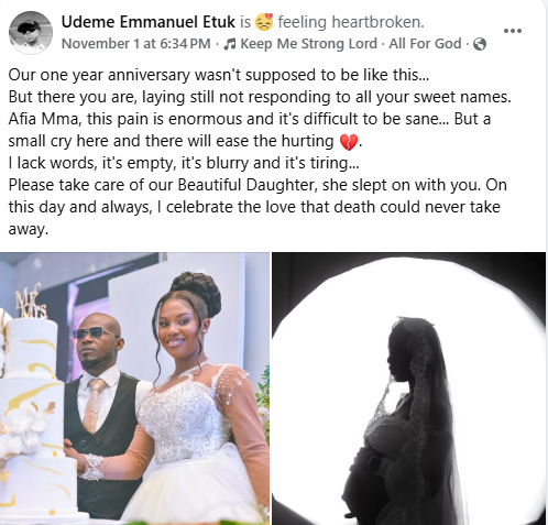 In a post shared on Facebook, Udeme expressed his grief, recalling that their first wedding anniversary was never supposed to end in tragedy. He wrote about the pain of seeing his wife “lying still” and not responding to her pet names, adding that he felt empty and broken. He also prayed for her to watch over their baby, who was laid to rest alongside her.