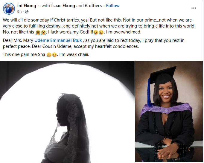 Cousin Ini Ekong also mourned the loss, saying it was heartbreaking to lose someone so young and full of promise. He said death was certain for all but should not come “in our prime or while trying to bring life into the world.” He prayed for Mary’s soul to rest in peace and sent his condolences to Udeme, describing the loss as one that left him weak and speechless.