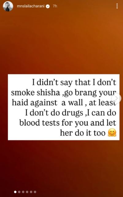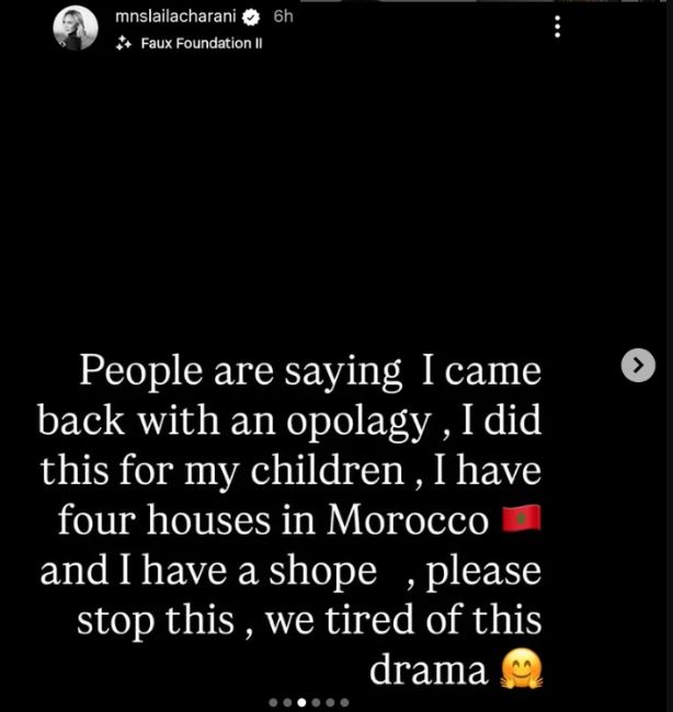 In her latest posts, Laila explained that she never denied smoking shisha but firmly stated she does not use drugs. She said she is willing to take a blood test and challenged Regina to do the same. According to her, she only returned to the marriage because of her children and is tired of the controversy. She added that she has her own houses and a shop in Morocco, dismissing claims that she came back because she had nowhere else to go.