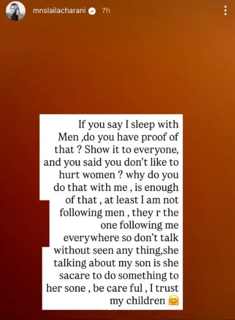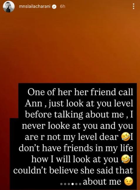 Laila also responded to a comment reportedly made by someone named Ann, asserting that they are not on the same level and stressing that she has no friends, so she couldn’t have been watching anyone.