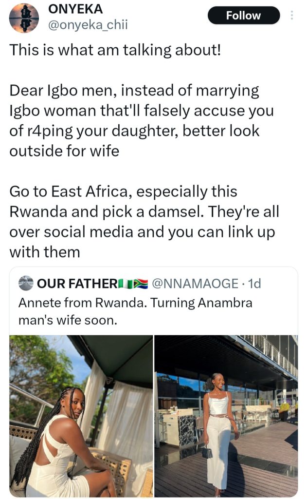 “This is what I am talking about! Dear Igbo men, instead of marrying an Igbo woman who might falsely accuse you, better look outside for a wife. Go to East Africa, especially Rwanda, and pick a damsel. They’re all over social media and you can link up with them.”