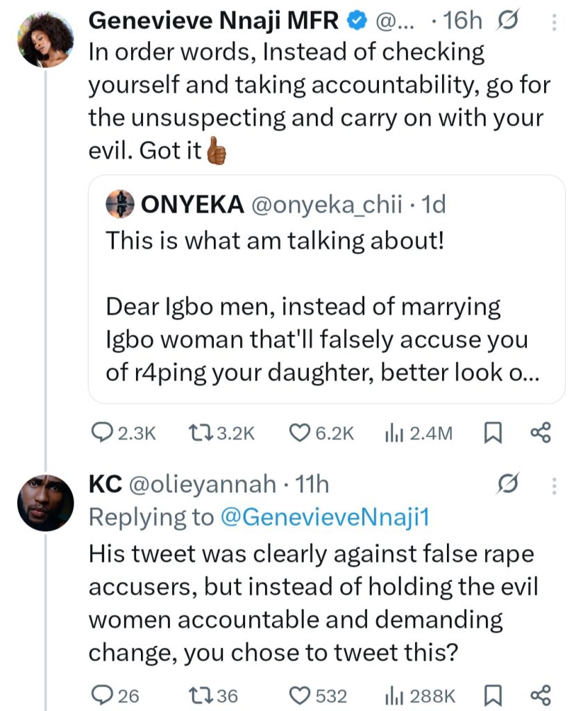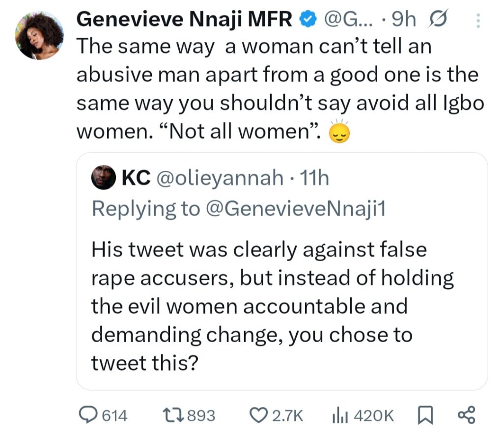 When another X user criticized her response, saying the original tweet targeted false r@pe accusations rather than all women, Genevieve clarified: