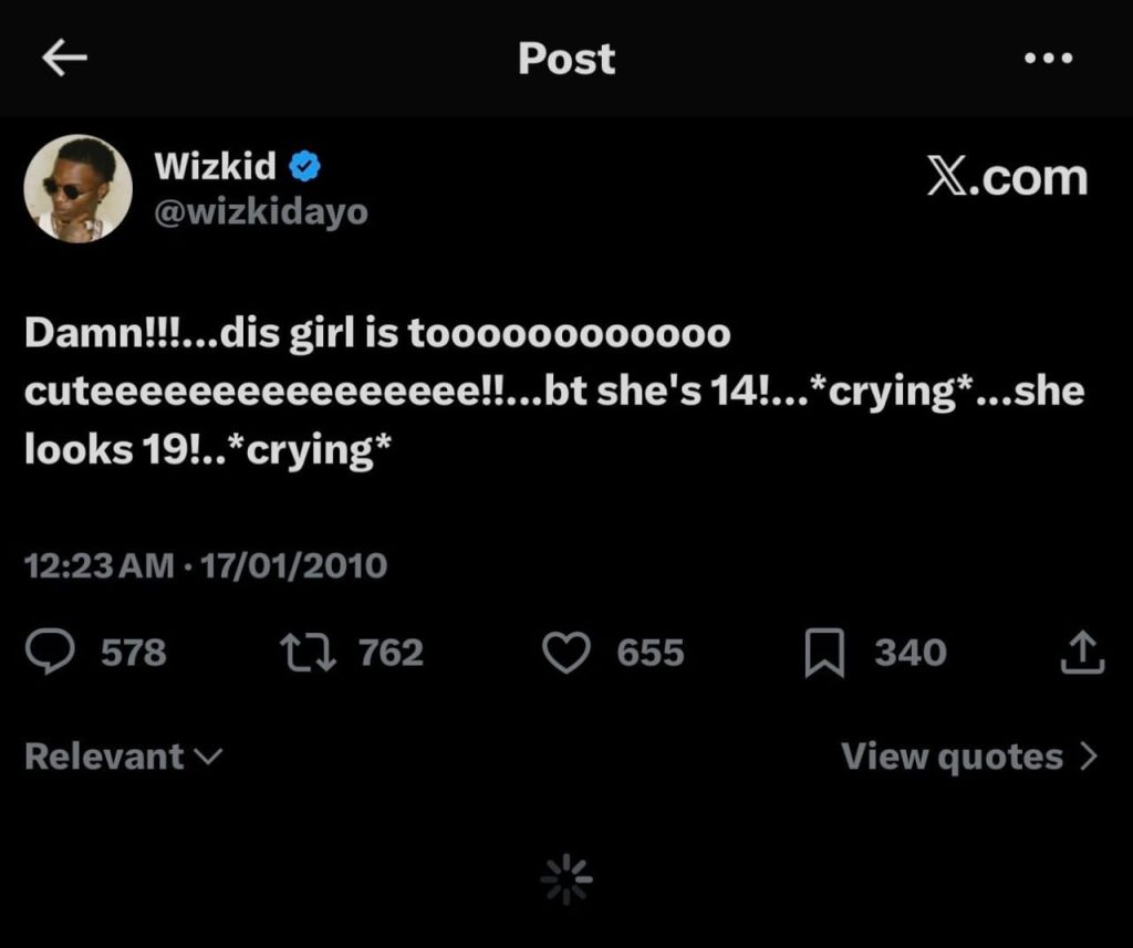 In the resurfaced post, shared on X at the time, the singer wrote about finding a girl attractive before learning she was 14, adding that she “looked 19.” The tweet, made when Wizkid was 20, quickly circulated across X as users debated its context.