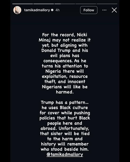 In her words, “For the record, Nicki Minaj may not realize it yet, but aligning with Donald Trump and his evil plans has consequences. As he turns his attention to Nigeria there will exploitation, resource theft, and innocent Nigerians will likely be harmed.”